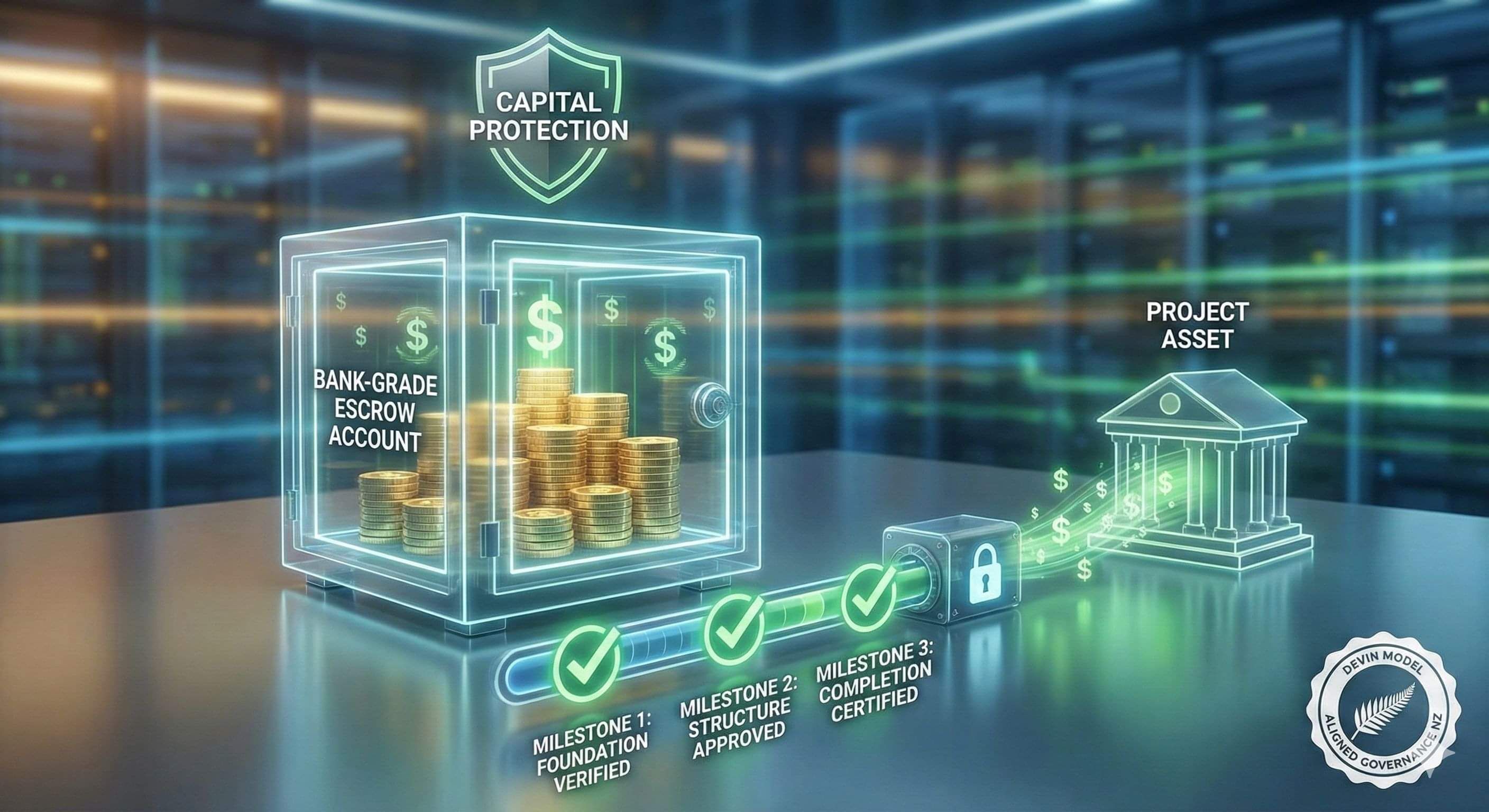 Every dollar you invest is secured in a bank-grade escrow account. Funds are only released when independently verified milestones are met, which fully aligns with the Devin Model property investment governance New Zealand principles and keeps your capital protected.
